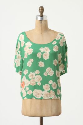 I really love the colors and print of this top. It's such a pretty, spring blouse and I've been looking forward to it going on sale for a while now. So when it finally hit the sale racks Tuesday, I headed on over to my local Anthro to try it on. The smallest I could find was a size 2, but I could have definitely sized down to a 0. I do like billowy tops, but this was a bit too boxy for me. In the stock photo above, it looks a bit more fitted around the waist and it appears to be longer. In real life though, it was very roomy (most likely because I was wearing one size too big) and very cropped. I would definitely have to wear this with higher-waisted pants or at least a camisole underneath, and I'm not sure how that would look. Also, when I turned to the side, the back looked a bit longer than the front, which I thought was kind of unusual. I really wanted to like this blouse, and maybe would have if I'd found it in a size 0, but it just wasn't for me. It was too boxy and too cropped for my taste. But I still really love the floral pattern and the combination of the green, coral, and cream is just so pretty.